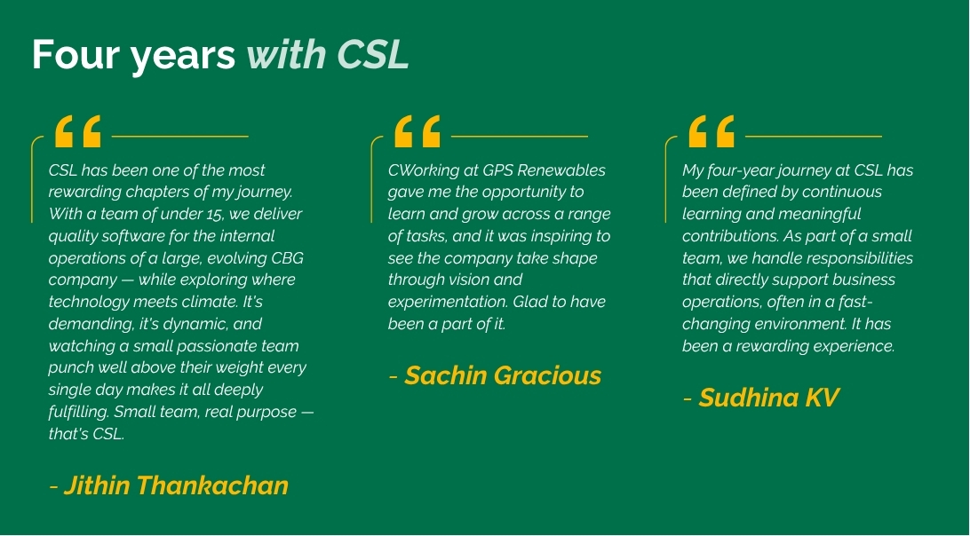 Every time someone at GPS Renewables logs a request, pulls up a report, or moves a task through an internal system, there is a quiet team behind it that built that experience and is probably already working on making it better. The foundation of the CSL team was built by its first members – Sudhina KV, Jithin Thankachan, and Sachin Gracious, who have been part of the team since the very beginning and continue to contribute significantly to its growth.